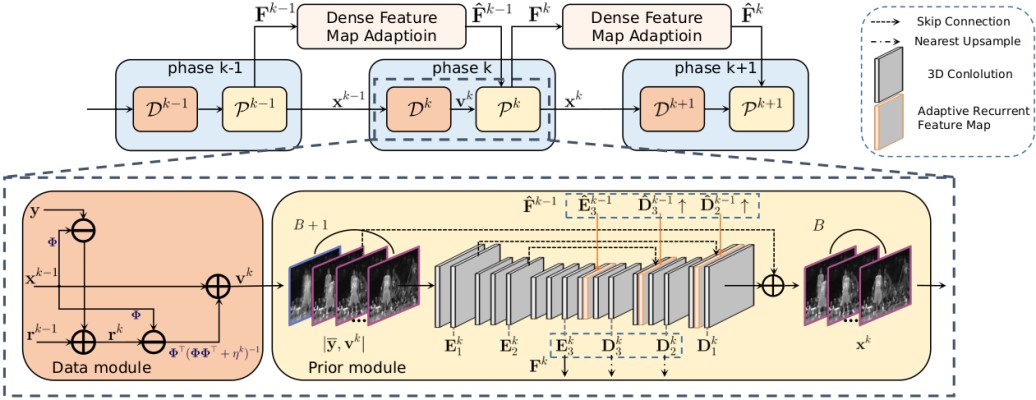 “Dense Deep Unfolding Network with 3D-CNN Prior for Snapshot Compressive Sensing”研究的内容是可解释性网络在视频压缩感知上的应用。视频压缩感知被广泛地应用在成像系统上,其目的是利用二维传感器来捕捉诸如视频亦或是光谱等高维信号。通过在成像系统中引入额外的硬件部件,高维信号被压缩成二维信号,随后运用重建算法完成二维信号到高维信号的重建,通过此类硬件加软件的形式,能够减少数据的存储空间和传输带宽。然而,现有的方法均存在一定的局限性,基于模型的方法需要迭代多次才能收敛,在速度上无法满足实时性,基于网络的方法又缺乏一定的可解释性,我院张健教授课题组的研究表明,基于深度展开的方法能够很好地利用两种方法的优势。该研究结果所设计的深度展开网络由优化压缩感知的半二次分裂算法(HQS)展开而成,深度展开网络的网络结构由数据模块和先验模块交替堆叠而成,其中引入3D卷积来提升深度展开网络对帧间相关性的表征能力;以及使用稠密特征融合技术减少信息在不同阶段之间传递引起的损失,以及帮助信息自适应地在不同阶段中传输。网络结构如下图所示: