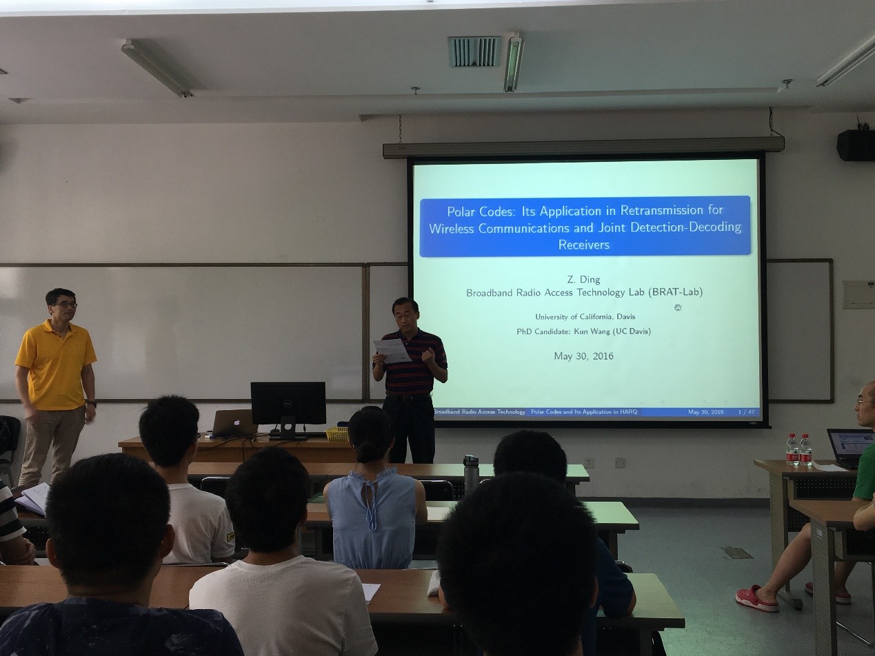 2016年5月31日,美国加州大学戴维斯分校丁峙教授应我院李革教授邀请,在C-102教室做了一场题为“Polar Codes: Its Application in Retransmission for Wireless Communications and Joints Detection-Decoding Receivers”的精彩报告,介绍了极化码在无线通信中的作用及无线通信中最新的接收机结构设计。我院师生积极与其进行学术讨论与交流,大家受益匪浅。