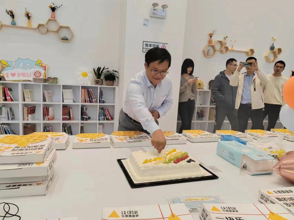 上午十二点许,生日会正式开始。会场内气球,海报和装饰精美放置,披萨,水果、点心等各种美食和小吃整整齐齐摆放在桌面上,气氛温馨愉悦。在会上,李倩副院长向教职工发表了简短的致辞,表达了学院对他们的感谢和认可,以及对未来的期望。随后田永鸿院长切生日蛋糕,“蛋糕上头,鸿运当头”为教职工送上生日祝福。教职工在会上尽情享受着美味的生日餐、互道祝贺。