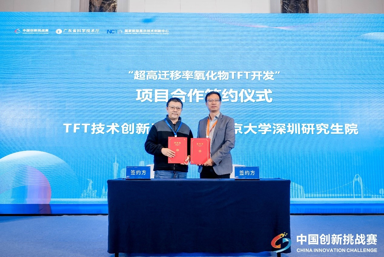 活动现场,经赛委会多次对接,促成的由TFT技术创新平台与北京大学深圳研究生院就“超高迁移率氧化物TFT开发”项目,Micro-LED显示创新平台和四川长虹电子控股集团有限公司就“高亮度Micro-LED投影显示关键技术研究”项目,反射式显示创新平台与浙江大学衢州研究院、广州智慧城市发展研究院分别就“电润湿电子纸用关键氟树脂材料开发”、“高速高压电子纸显示驱动芯片”项目,国创中心本部与南京大学就“无胶光刻量子点技术”项目,显示装备创新平台与厦门大学就“扫描探针显微及光谱检测方法与装置研发”项目等共计6项重大技术合作项目进行了现场签约。