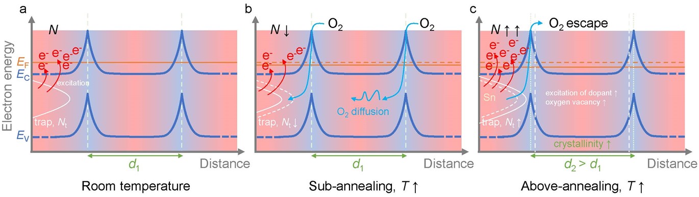 图2. 晶界势垒模型:低温热效应与高温退火对透明导电氧化物内部结构的不同影响