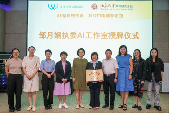 授牌仪式圆满举行,正式宣告邹月娴执委AI工作室成立。北京大学深圳研究生院党委副书记、深圳市妇联执委、深圳市南山区妇联兼职副主席邹月娴进行了邹月娴执委AI工作室报告,对邹月娴执委AI工作室进行介绍,致力于提升深圳女性在AI领域的竞争力,通过培训、技术推广、科普讲座等活动,促进女性在科技领域的就业和创新。同时探讨了AI技术的发展机遇与挑战,鼓励女性在科技界发挥更大作用。参会嘉宾合影留念。