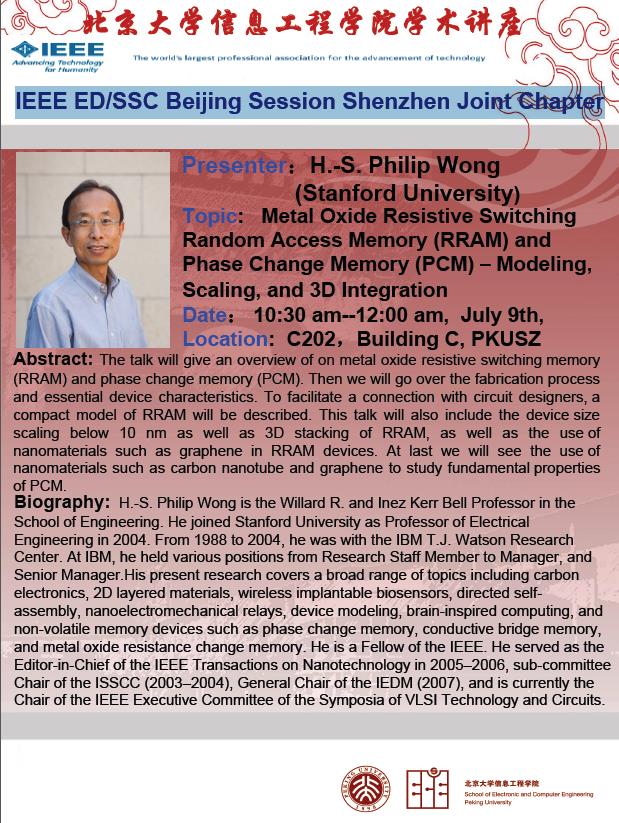 【学术讲座】Prof.Philip Wong(斯坦福大学):"Metal Oxide Resistive Switching Random Access Memory (RRAM) and Phase Change Memory (PCM) ...