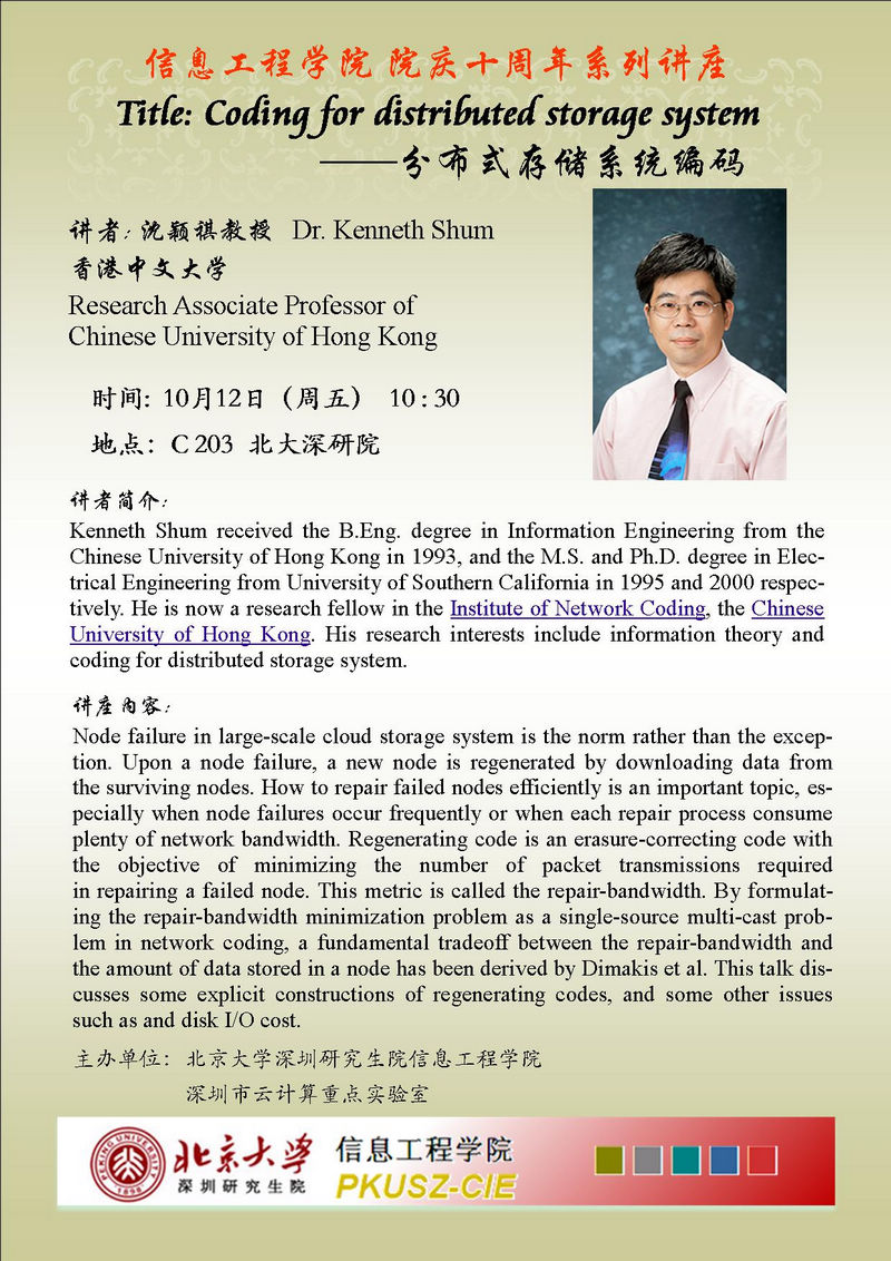 【伟德体育官网院庆十周年系列讲座】沈颖祺教授:分布式存储系统编码