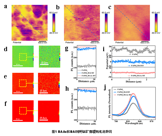 离子液体盐作为钙钛矿前驱体溶液的添加剂时,可以提高太阳能电池的效率和稳定性。然而,离子液体作为添加剂的成功与否高度依赖于前驱体配方和钙钛矿结晶过程,这给工业规模的实施带来了挑战。在本研究中,一种室温旋涂的离子液体—醋酸正丁胺(BAAc),被证实是一种理想的钙钛矿(FAPbI3)薄膜钝化剂。与其他钝化方法相比,室温BAAc封盖层(BAAc RT)对FAPbI3钙钛矿表面缺陷的钝化更加均匀和彻底。此外,它为空穴提取提供了更好的能级匹配。结果表明,具有BAAc封盖层的n-i-p钙钛矿太阳电池的PCE为24.76%, Voc为1.19 V, Voc损耗约330 mV。采用BAAc RT制备的钙钛矿微型组件(有效面积12 cm2)的PCE达到20.47%,证明了该方法制造大面积钙钛矿太阳能电池的有效性和可行性。此外,BAAc钝化层还提高了未封装的FAPbI3钙钛矿太阳能电池的长期稳定性,在室温下相对湿度为35%的空气环境中储存时,T80寿命可达3500 小时。