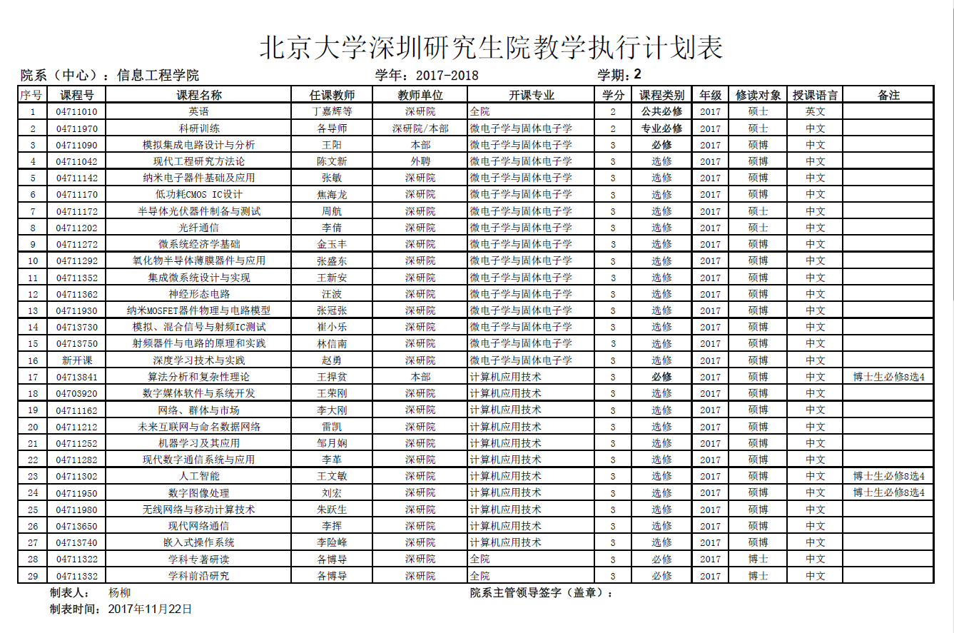 北京大学深圳研究生院2017-2018学年第一学期执行计划