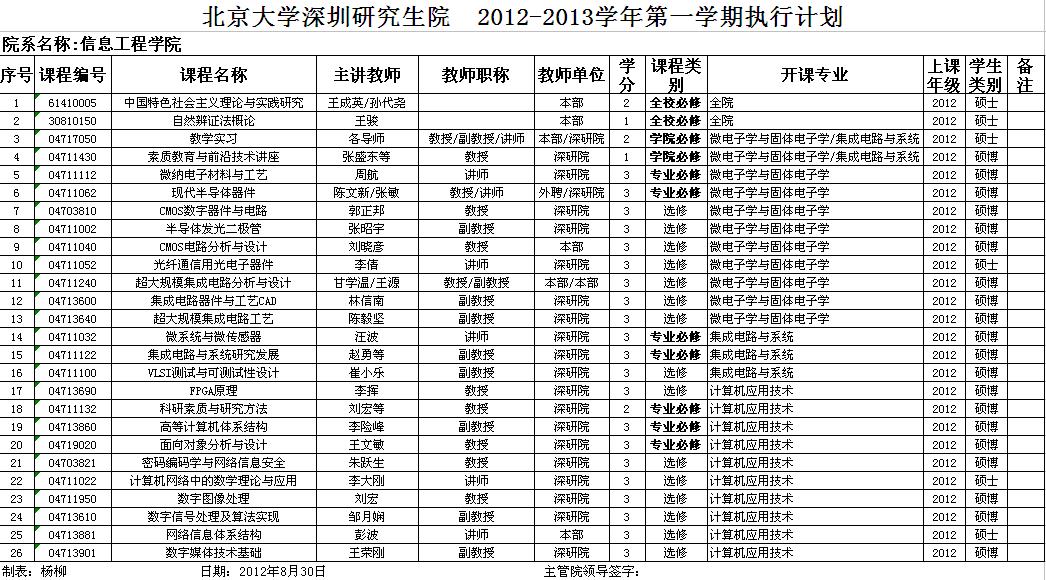 北京大学深圳研究生院 2012-2013学年第一学期执行计划