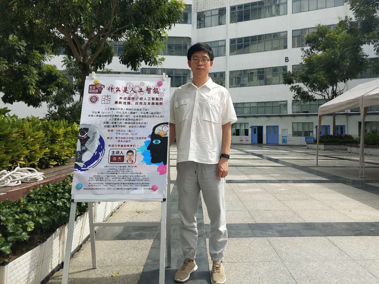2020年9月29日下午,在伟德体育官网教工党支部党支书李倩老师的带领下,党员教师代表陈杰老师、张婧老师、廖聪维老师和学生代表博士生詹家鳍语同学前往南方科技大学第二实验学校,为六年级的同学们举办了一场科普讲座。本次讲座作为“科技进校园”志愿服务系列活动之一,贯彻了“将专业建设融入党建、用专业知识为群众服务”的宗旨,通过介绍人工智能技术来普及推广科技教育,启迪和拓展青少年的思维、激发学生学习科学的热情来提高他们对科学技术的认识,帮助树立科研报国的远大志向。